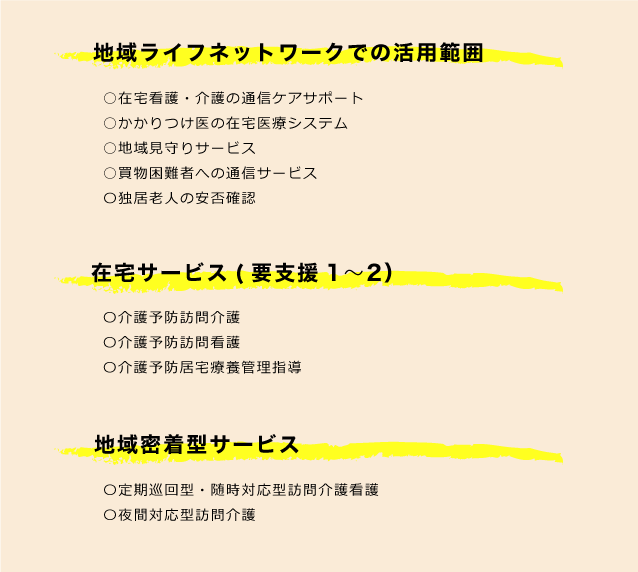 地域での「防災・防犯」を含め「家事代行」「買物サービス」「見守りサービス」など高齢者やお子様の生活を支援する最適なプランです。また、ご自宅の患者様やご利用者様とを結び「介護予防」「介護予防居宅療養管理指導」「かかりつけ医連絡ツール」などのオペレーションシステムとしてお使いいただくことも可能です。